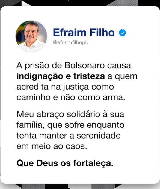 O senador Efraim Filho (União Brasil), pré-candidato ao governo da Paraíba e aliado declarado do bolsonarismo, usou as redes sociais na tarde deste sábado (22) para comentar a prisão preventiva do ex-presidente Jair Bolsonaro (PL). Em tom de crítica, Efraim classificou a decisão do Supremo Tribunal Federal como motivo de “indignação e tristeza”.