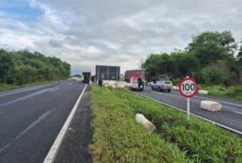 Um caminhão carregado de fardos de algodão tombou, na manhã desta sexta-feira (7), no Km 138 da BR 230, próximo