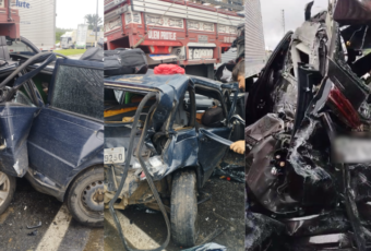 Um acidente envolvendo dois carros, um caminhão e uma carreta deixou três pessoas feridas na manhã desta terça-feira (27), na