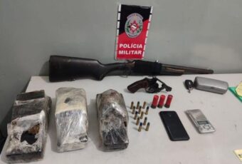 A Polícia Militar durante operação prendeu dois homens e apreendeu armas, munições e drogas. A ação policial ocorreu na noite