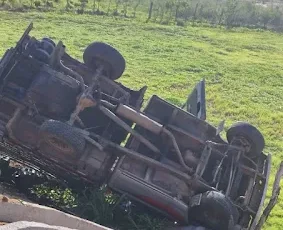 Uma caminhonete modelo F 1000 carregada de gado tombou no trevo que liga o distrito Pitombeira de Dentro (Santana dos