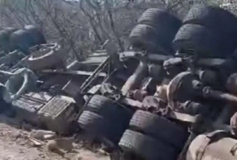 Na tarde desta terça-feira (26), uma carreta carregada com material de construção tombou em uma ladeira localizada entre os municípios