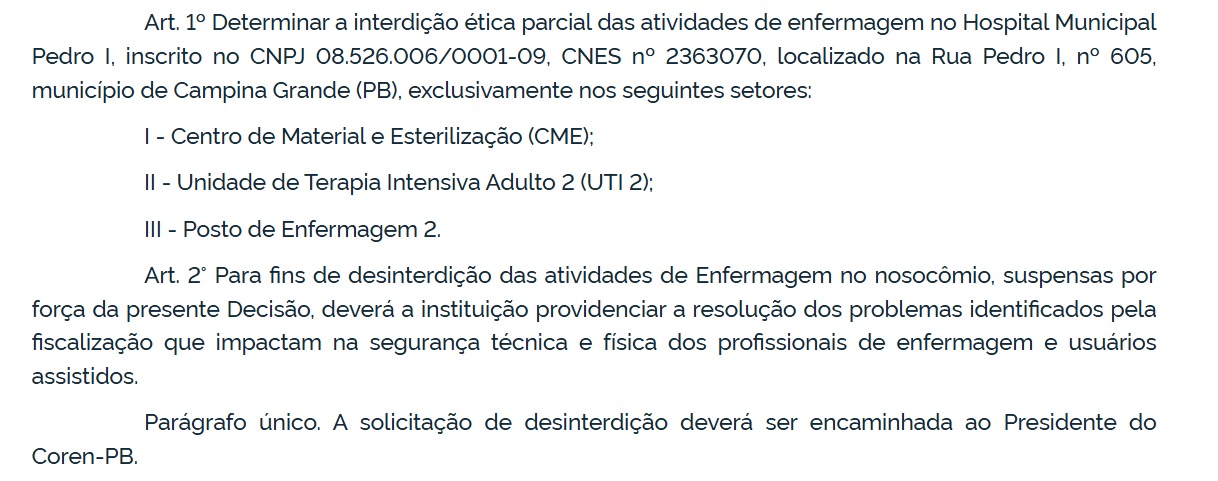 O Conselho Regional de Enfermagem da Paraíba (COREN-PB) determinou a interdição ética parcial das atividades de enfermagem no Hospital Municipal Pedro I, em Campina Grande. Decisão foi publicada no Diário Oficial da União (DOU) desta sexta-feira (14).