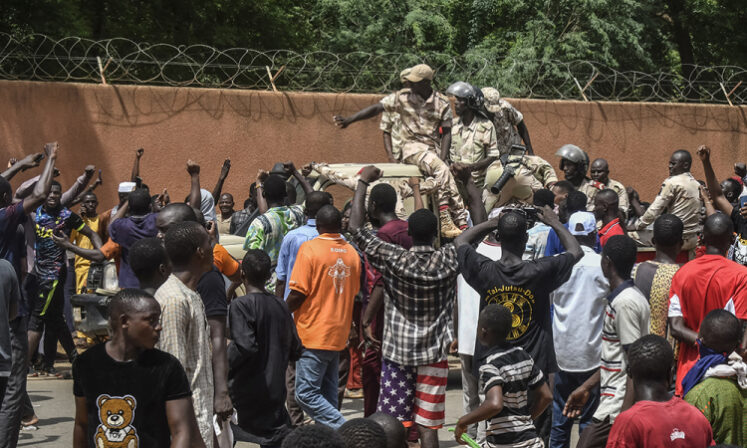 Milhares de pessoas se manifestaram neste domingo, 30, em frente à embaixada francesa em Niamei, capital do Níger, em apoio ao golpe militar que tirou o presidente Mohamed Bazoum do poder. Bandeiras do país africano e da Rússia foram colocadas no lugar da bandeira francesa, pisoteada por manifestantes que gritavam: “Viva Putin!”, “Viva a Rússia!”, “Abaixo a França!”. O presidente francês, Emmanuel Macron, e a União Europeia anunciaram neste sábado, 29, a suspensão de acordos que garantiam ajuda financeira ao Níger. A Comunidade Econômica dos Estados da África Ocidental (Cedeao) também impôs sanções financeiras e ameaçou o “uso da força” contra os autoproclamados novos líderes do país.