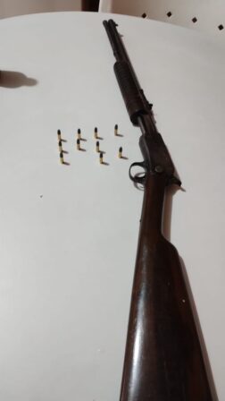 No interior da residência foi localizado um rifle calibre 22 e dez munições intactas; motivo pelo qual foi autuado em flagrante delito, por posse irregular de arma de fogo, além do cumprimento do mandado de prisão.