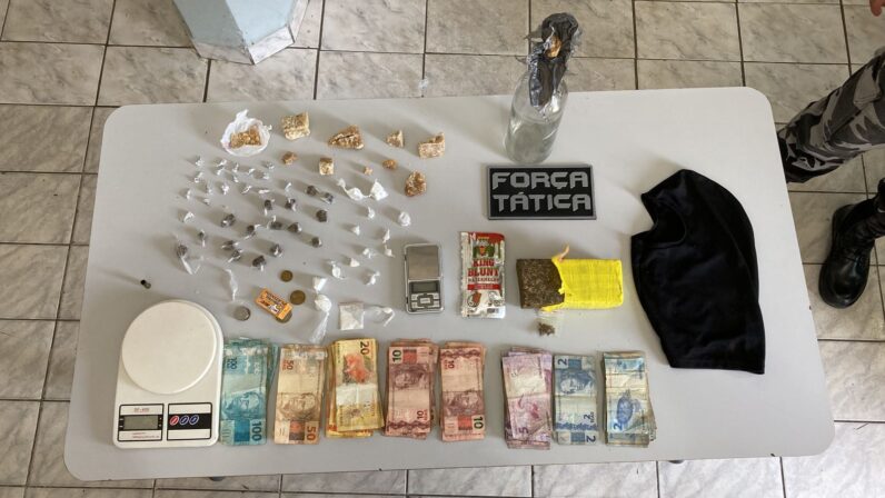 Além do suspeito, os PMs apreenderam, um tablete de 405g de maconha, 185g de crack, 15 papelotes de cocaína, uma garrafa de éter, duas balanças de precisão, R$1.463,85 reais, uma moto Honda Broz, além de munição deflagrada.