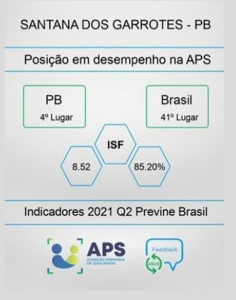 O Ministério da Saúde divulgou nesta sexta-feira (01/10) os resultados alcançados pelos municípios da Paraíba no Programa Previne Brasil e o município de Santana dos Garrotes ficou em 4º lugar no Estado da Paraíba, atingindo uma pontuação de 8,52 no Indicador Sintético Final no segundo quadrimestre 2021.
