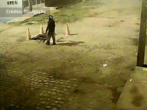 O suspeito chega com capacete na cabeça e leva os quatro objetos que estão demarcando uma pequena área em reforma e foge.