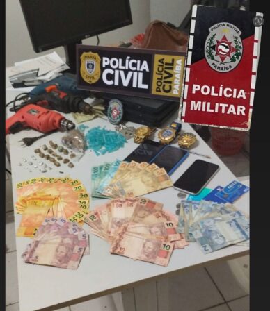 A ação aconteceu no bairro Cruz da Menina em Coremas, no Vale do Piancó. Os policiais apreenderam aproximadamente três mil reais em dinheiro, 19 papelotes de maconha, 10 embalagens de crack, tablete de maconha, joias, computador, telefones, furadeiras,cartões de créditos,